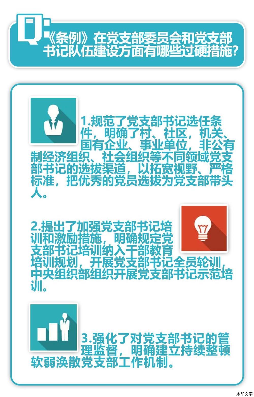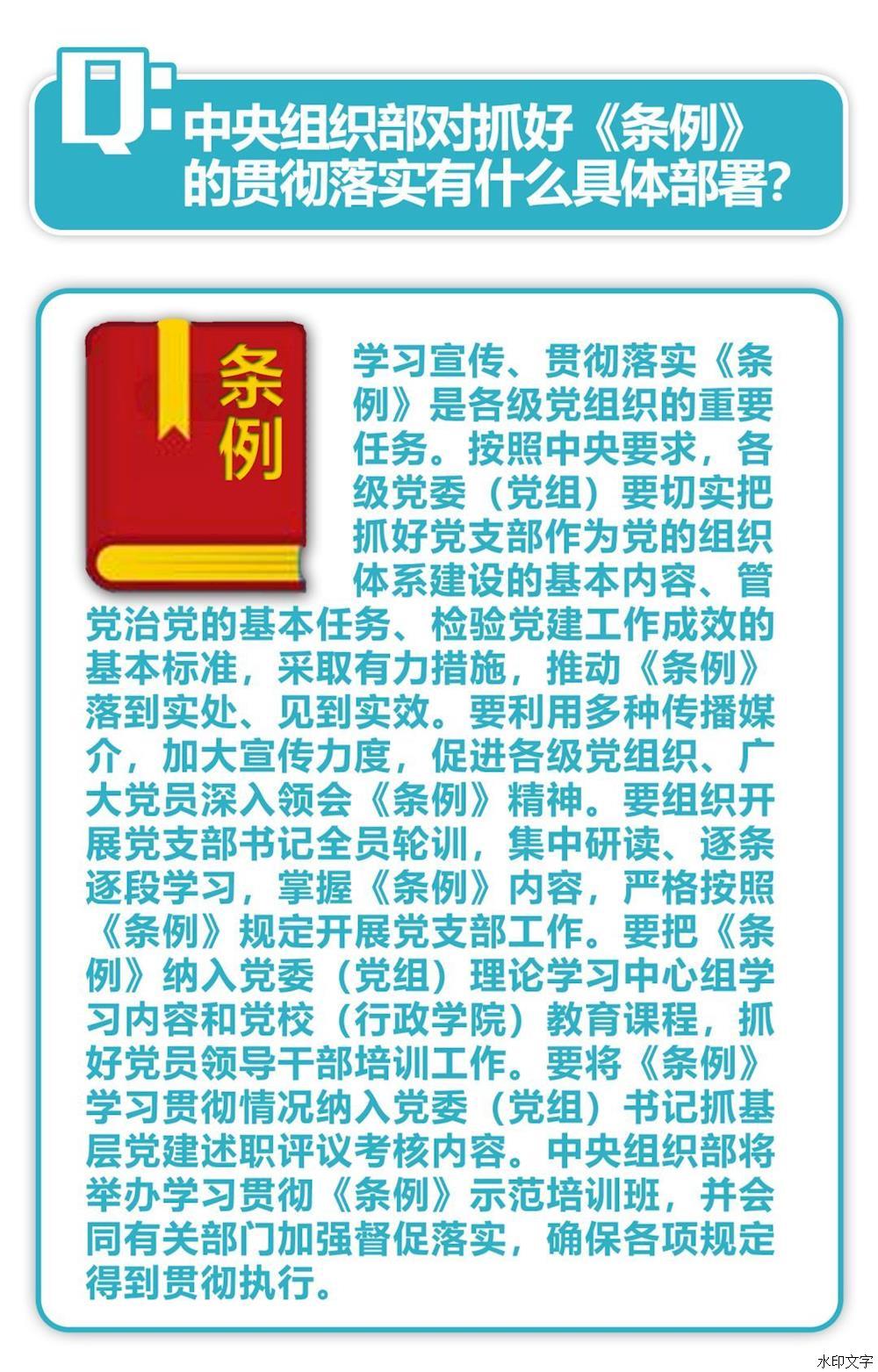 通知強調,重視黨支部、善抓黨支部,是黨員領(lǐng)導干部政治成熟的重要標志。各級黨委(黨組)要牢固樹(shù)立政治意識、大局意識、核心意識、看齊意識,切實(shí)把抓好黨支部作為黨的組織體系建設的基本內容、管黨治黨的基本任務(wù)、檢驗黨建工作成效的基本標準,采取有力措施,推動(dòng)《條例》落到實(shí)處、見(jiàn)到實(shí)效。要抓好《條例》的學(xué)習宣傳和貫徹落實(shí),利用報紙、廣播、電視和手機、網(wǎng)絡(luò )等媒介,通過(guò)專(zhuān)題研討、集中培訓等方式,使各級黨組織、廣大黨員特別是黨支部書(shū)記深入領(lǐng)會(huì )《條例》精神,全面掌握《條例》內容,切實(shí)增強貫徹執行《條例》的思想自覺(jué)和行動(dòng)自覺(jué)。要加強對黨員領(lǐng)導干部的培訓,把《條例》納入黨委(黨組)理論學(xué)習中心組學(xué)習內容和黨校(行政學(xué)院)教育課程,提高各級領(lǐng)導班子抓好黨支部工作、推動(dòng)黨支部建設的本領(lǐng)。要加強監督檢查,對貫徹落實(shí)《條例》不力的嚴肅追責問(wèn)責。中央組織部要會(huì )同有關(guān)部門(mén)加強督促落實(shí),確保各項規定得到貫徹執行。