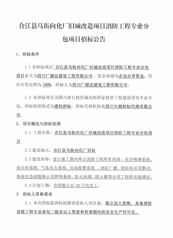 合江縣馬街向化廠(chǎng)舊城改造項目消防工程專(zhuān)業(yè)分包項目招標公告