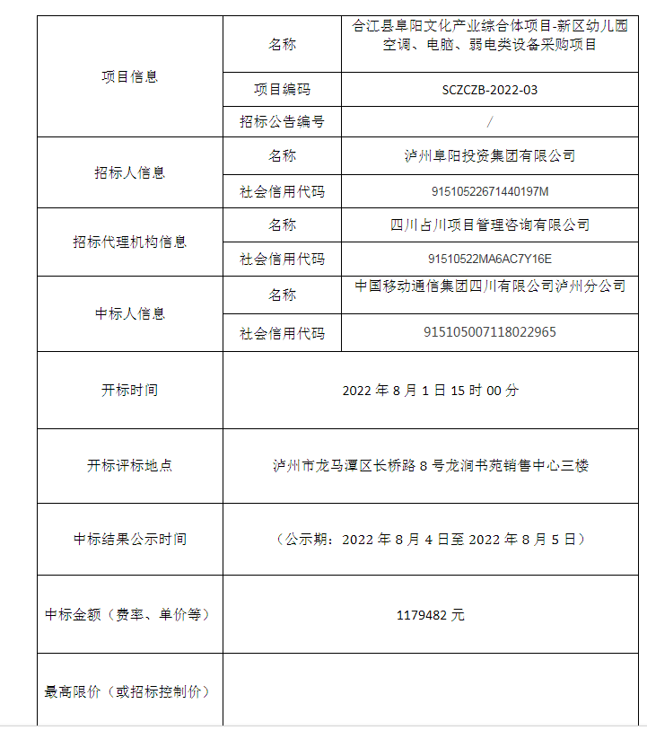 合江縣阜陽(yáng)文化產(chǎn)業(yè)綜合體項目-新區幼兒園空調、電腦、弱電類(lèi)設備采購項目公開(kāi)招標中標結果公告